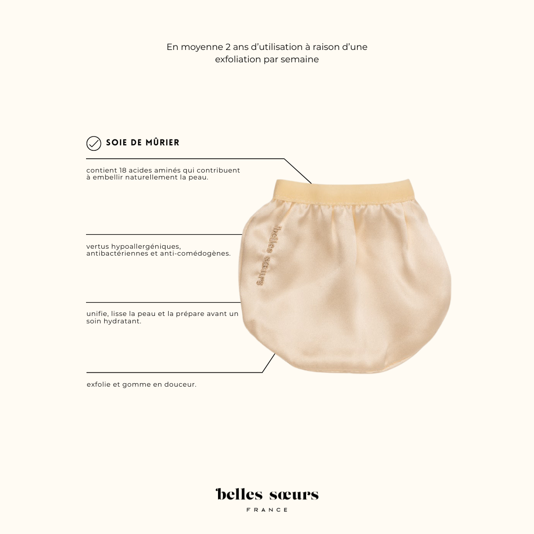 Les bienfaits de l'exfoliation à la soie de mûrier : la soie contient 18 acides aminés qui contribuent à retarder le vieillissement de la peau. Grâce à ses vertus hypoallergéniques, antibactériennes et anti comédogènes, c'est un allié puissant contre les imperfections. L'exfoliation de la peau à la soie de mûrier permet un gommage tout en douceur, plus naturel et beaucoup moins abrasif que le gommage en grain, parfois difficile à utiliser pour les peaux sensibles. Il ne nécessite aucun produit complémentaire. Il permet ainsi de préparer la peau pour tirer tous les bénéfices des actifs et décupler l'effet des Sérums et Crèmes Belles Sœurs.